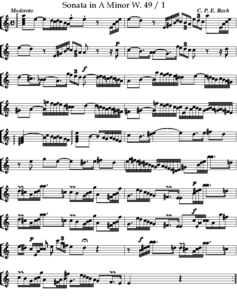 This is the first of a couple of flute solos I did based on clavier sontatas by C. P. E. Bach. They really seem to lend themselves very naturally to the flute - at least it seems so to me. It can be played on a one-keyed flute, but you might enjoy playing it on a multi-keyed flute also. The score is done using The Copyist, which is a bit crude, but I think it's fairly clear. Watch out for the accidentals, however.