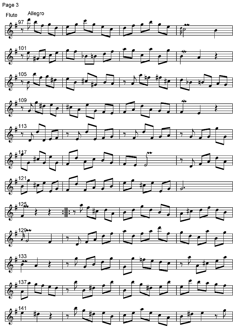 This is the second of the flute solos based on clavier sontatas by C. P. E. Bach. This time it's a complete, 3 movement sonata, rather than just a single movement. This one is also considerably more straightforward than the previous example, but still, I think, very beautiful to play. The score is done in Cubase - the results are not quite a nice as with Finale, but it's also a lot less work (I find) than Finale. Watch out for the appoggiaturas, which are to be played long, in the old manner, not as quick "grace notes".