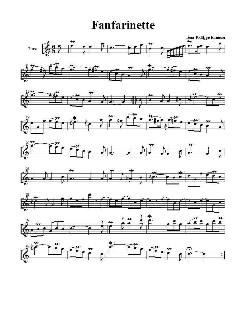 From a very catchy little harpsichord piece by Rameau. If you're Canadian you will probably be familiar with this as the theme for CBC FM's afternoon drive-time show "Disk Drive". An amiable little air to tootle on the flute. This was done in Finale (in fact it was my first experiment trying to learn the product).