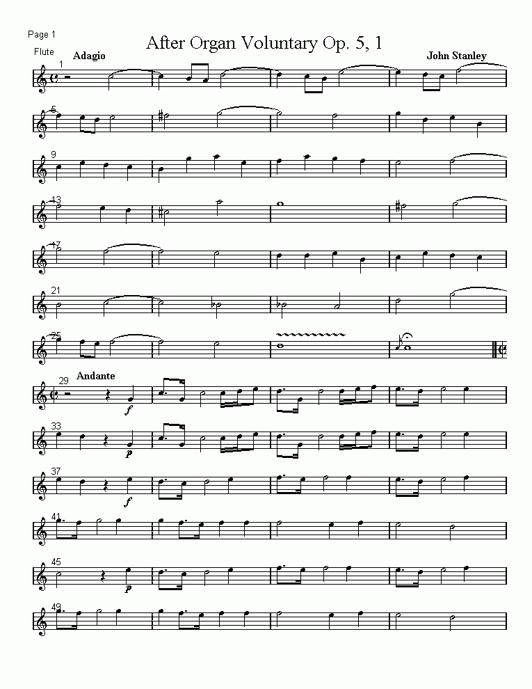 Somehow the term "Organ Voluntary" doesn't at all seem to conjure up the feeling of this piece. It's more in the nature of a sonata, and it sounds quite natural on the flute (well, except perhaps for the short, slow first movement, which could either be omitted or embellished...) Done in Cubase. Stick with it, by the way, even if you find the first couple of pages a bit boring - most of the interest is in the last movement. Oh - I left one low C in there somewhere... it comes after a higher C which, obviously, you can just sustain on a flute without a C foot.