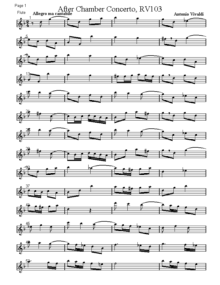 A three movement (fast, slow, fast) chamber concerto, with the first movement being the most substantial. Very appealing melodies. This was done in Cubase Score, so the quality is better than the Goldberg Aria (previous). The 'flute' in the original scoring was presumably a 'flauto dolce', i.e. a recorder, but it sounds pleasant on the transverse flute (although it does have high f's which are a bit of a challenge on the one-keyed flute).